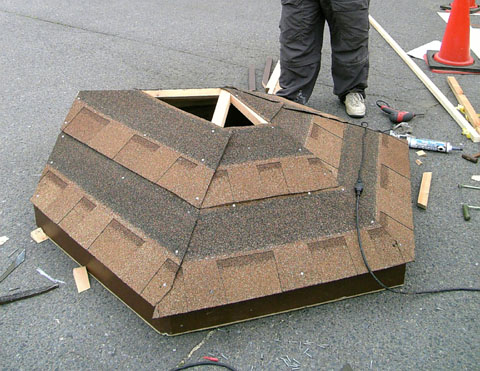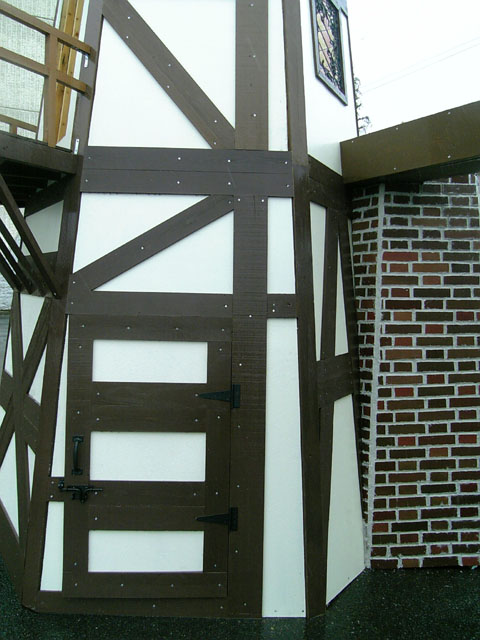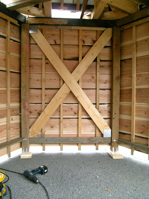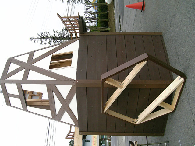 風車塔下の部分の写真です。土台を移動した日に杉板を全て張ってしまうつもりだったのに手間取りました(汗 ついでに柱の下に取り付けられているのは、駐車場の地面が斜めっているのでそれによる本体の傾きを補正したものです。例年はやる必要が無いのですが、今年は六角形の土台を作ったので補正しないとズレが酷いことになってしまうので。これは計算外でしたね(汗